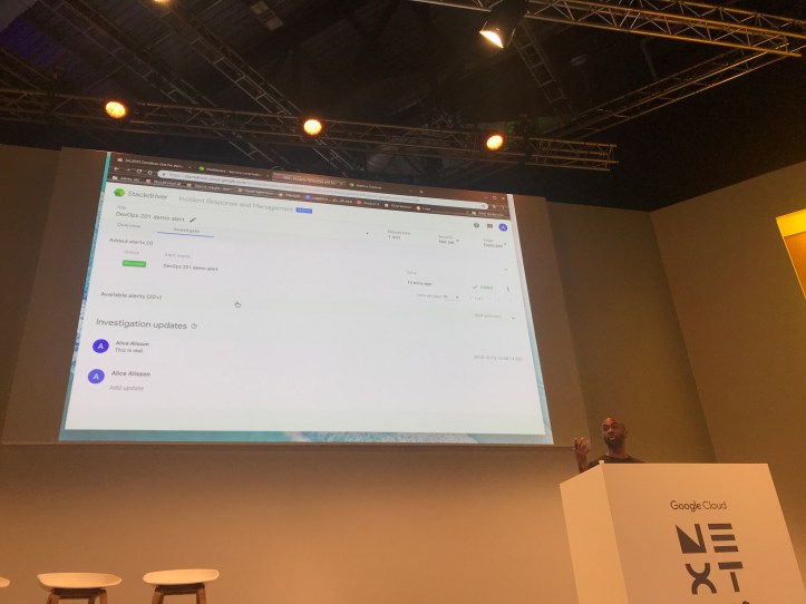 Andre moves on to a live demo of the alpha version of IRM. IRM is integrating monitoring and insights from Stackdriver with a central incident management site where responders can take actions and provide updates on an incident.