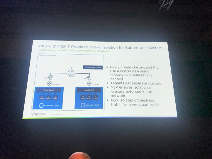 Using NSX-T allows for clusters to be isolated from each other and for orchestrator traffic to be isolated from container networks. This is automated as clusters are provisioned.
