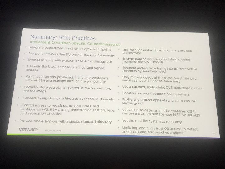 Steve wrapped up by saying the NIST Guide is essential reading and provided a summary of best practices, protecting the entire stack. You can find the NIST guide here.